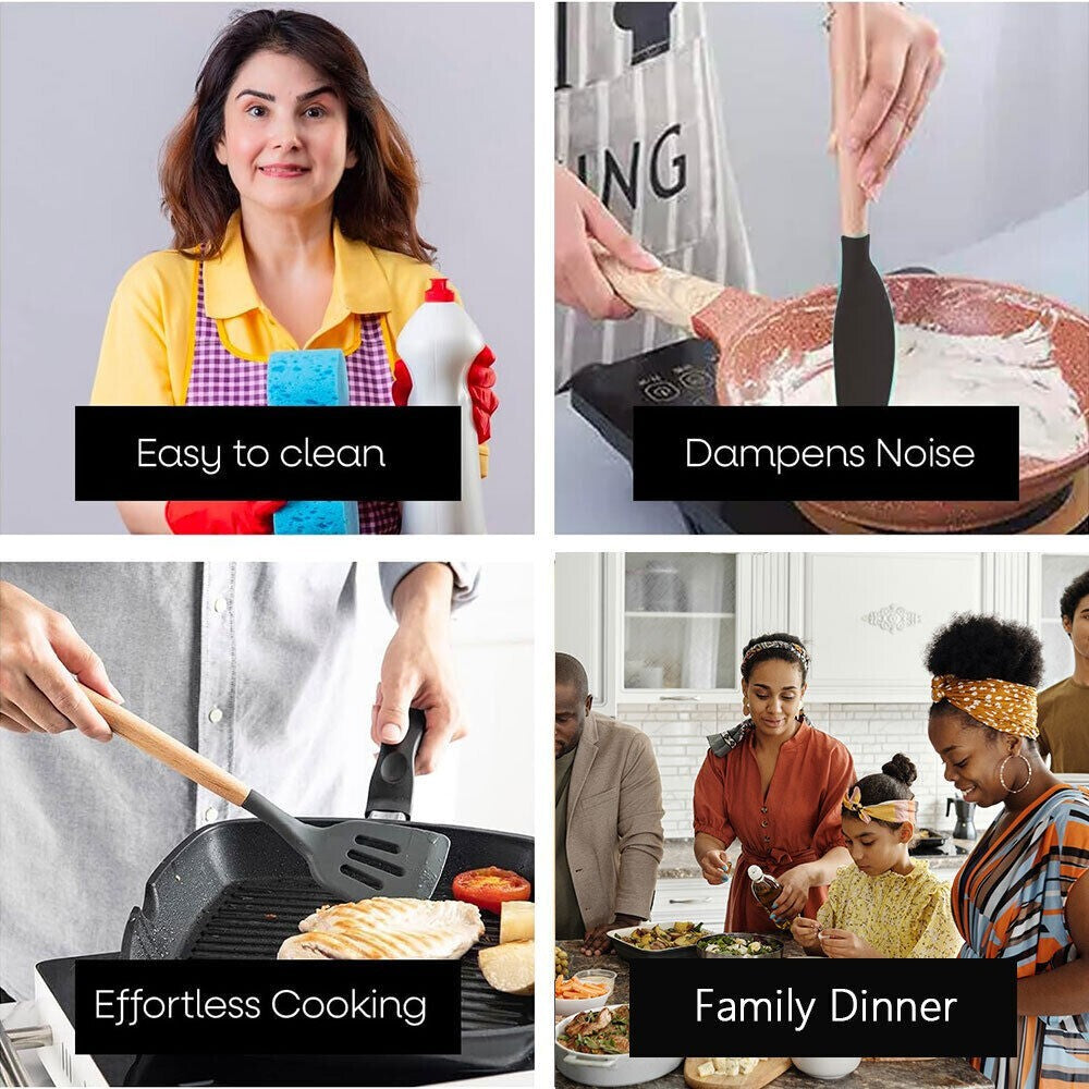 Upgrade your kitchen with this elegant 12-piece silicone cooking utensil set featuring sturdy natural wooden handles and premium food-grade silicone heads. Designed to be gentle on non-stick cookware, heat resistant, and stylish for any modern kitchen.